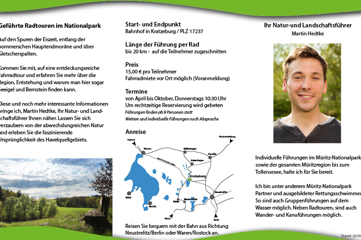 Führungstermine:April bis Oktober jedenDonnerstag um 10.30 Uhr ab Kratzeburg (Teilnehmerabhängig, Anmeldung vorab nötig)
