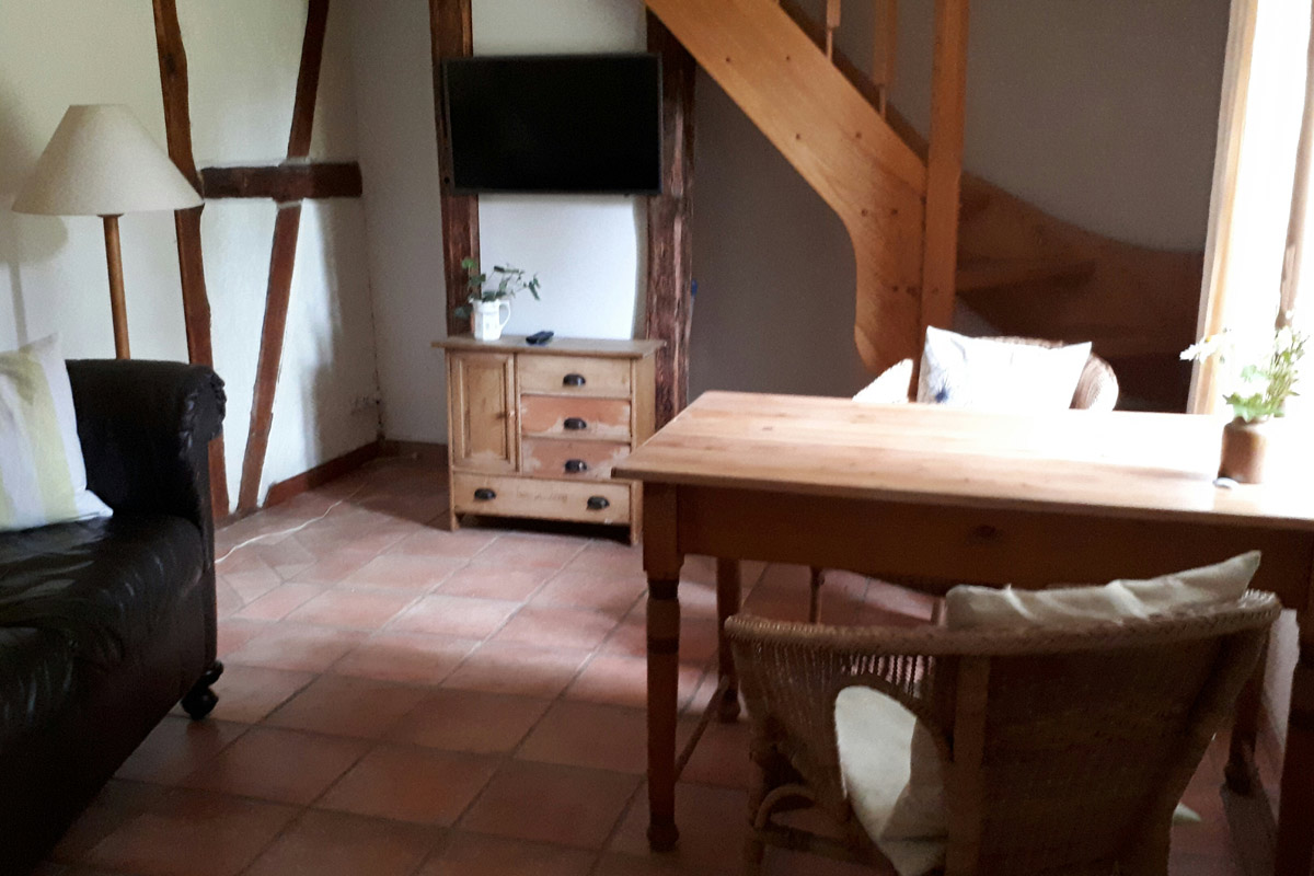 Wohnraum: Sofa, Esstisch, TV, Radio m. CD,